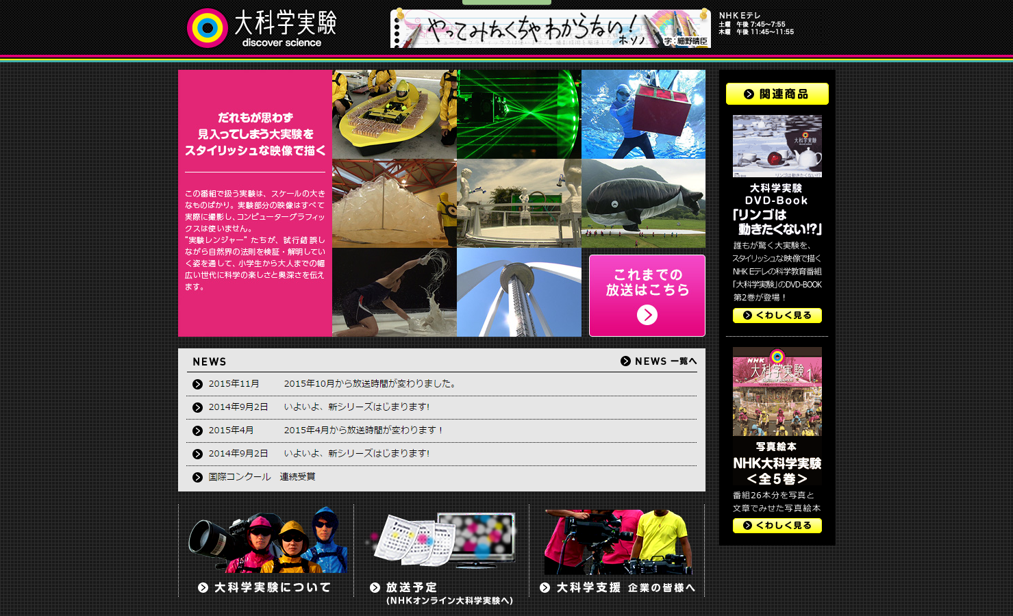 NHK/NHKエデュケーショナル/アルジャジーラ子どもチャンネルの3者共同制作による科学教育番組『大科学実験』のサイト。番組、関連商品、科学教育支援に関する情報を伝えます。『大科学実験』はだれもが思わず見入ってしまう大実験をスタイリッシュな映像でお送りします。