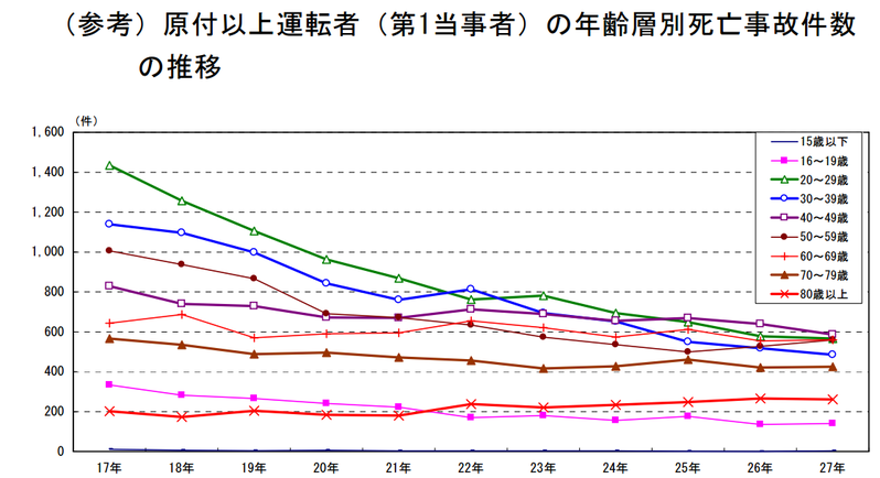 - 先週免許更新行ってデータ出てたけど2016年度の交通事故の4割が65才以上だったらしいね、年代別の割合にしたら高齢者は少し多いくらいだけど運転人口が分からんから微妙な数字やな
