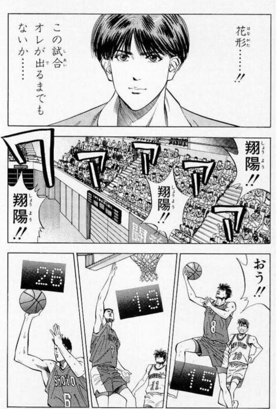 - 沢北が劣勢と感じてる中で深津と河田のアリウープ一発。沢北が先輩達スゲーって描写が一番好きだったな。同じレベルの相手がいなくて寂しがってる沢北が頼れるチームメイトを得られたみたいだし