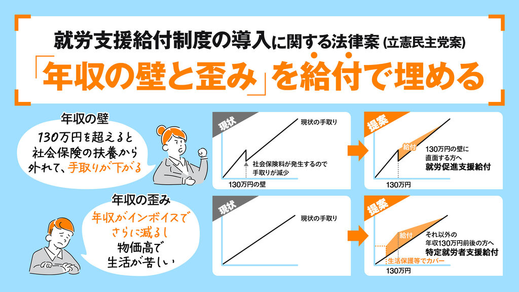 立憲民主党の「年収の壁」(103万円の壁、130万円の壁)等を給付で埋める「就労支援給付制度の導入に関する法律案」をバージョンアップして各党に実現を呼びかけます。