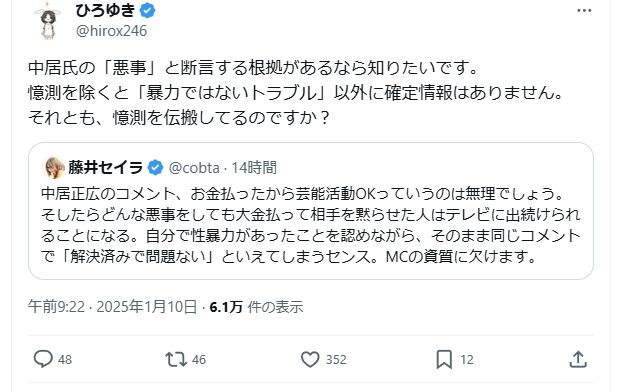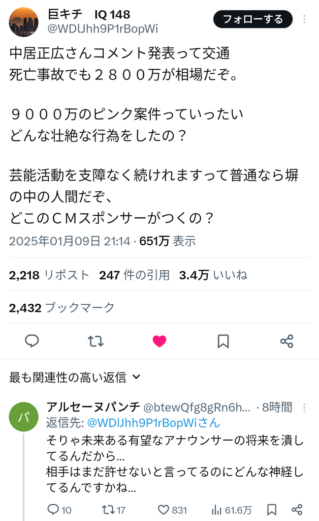 - まぁ、中居の場合セクハラレベルでも訴えられた時の損害は9000万どころじゃないから何とも言えんというのはわかる。