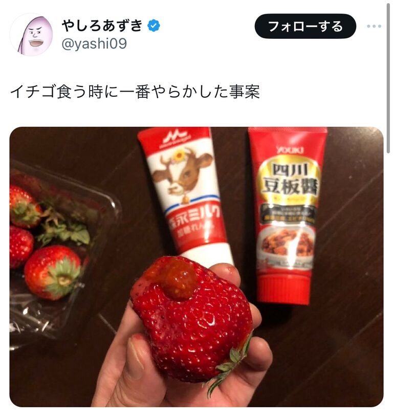 チューブ2本とも置いて豆板醤乗せたいちごをカシャッ!狙いすぎて冷める