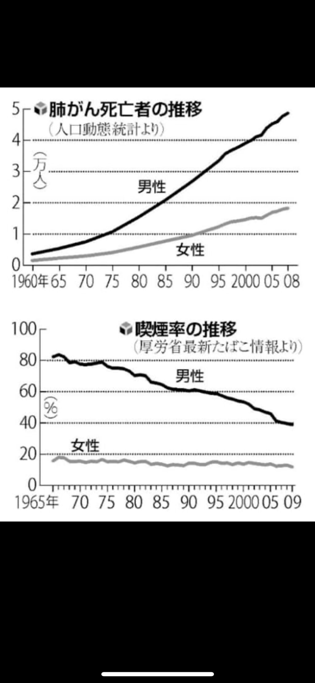 女性の喫煙率はほぼ横ばいなのに、肺癌の死亡率が上がっていることからわかるように、喫煙率に関係なく肺癌の死亡率が上がっている。これは他の病気の死亡率が下がったことにより相対的に肺癌の死亡率があがっている可能性が高い。医療の進歩で他の病気を克服しているからね。