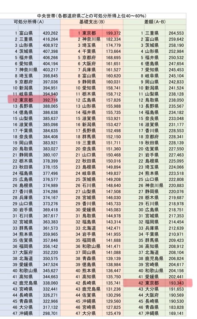 一方物価・基礎支出は確かに全国1位なので、差額(経済的余裕)は東京は全国でも下位。