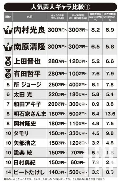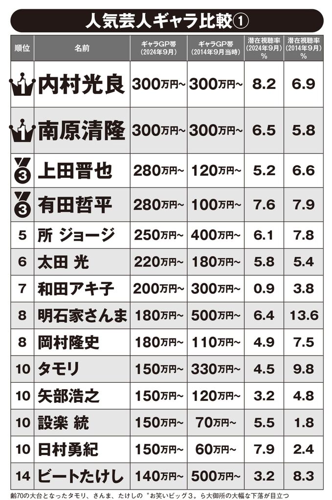 今回、FRIDAYはある大手テレビ局が’24年9月末時点で作成した人気MC芸人の「最新ギャラリスト」を入手した。リストに記載されているのは、ゴールデン・プライム帯(午後7~11時)の1時間番組でMCを務めた場合の最低ラインの金額だという。今回、FRIDAYは10年前のギャラリストの入手にも成功。下記の表はリストをもとに、’24年の人気MC芸人のテレビギャラを編集部でランキング化したものだ。’14年から10年での上下動を見ながら、「本当の実力者」が誰なのか分析していこう。