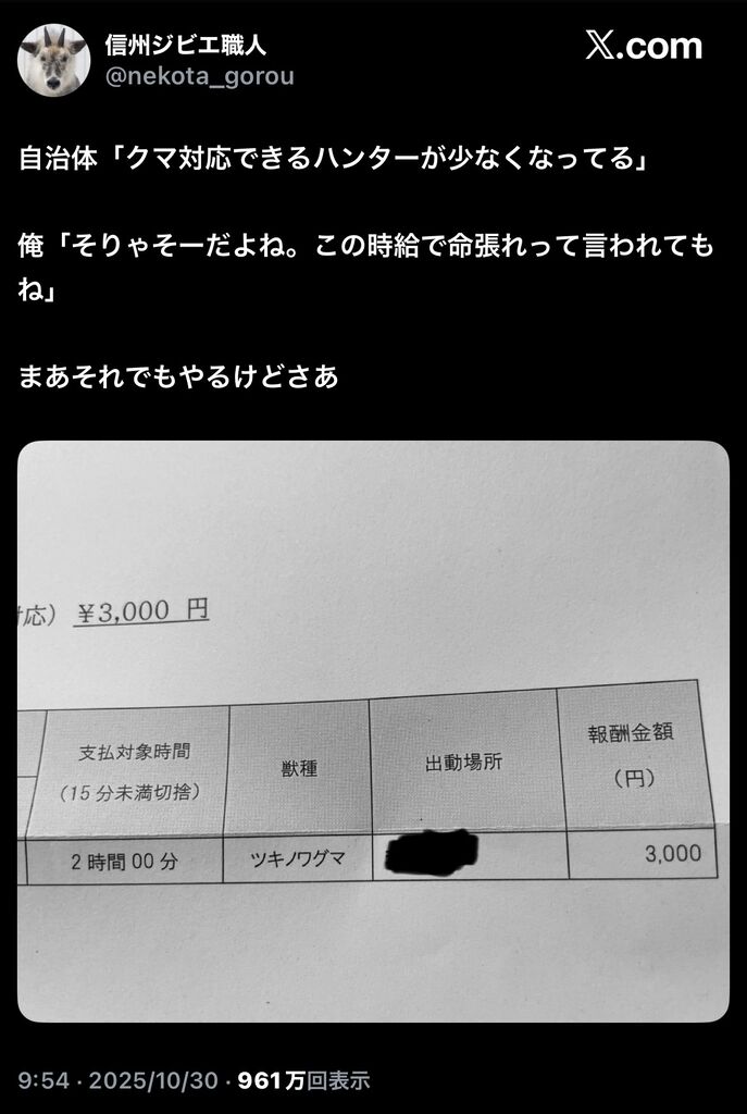 こういう自分に酔ってるバカがいるせいで熊駆除の料金が上がらないのでは