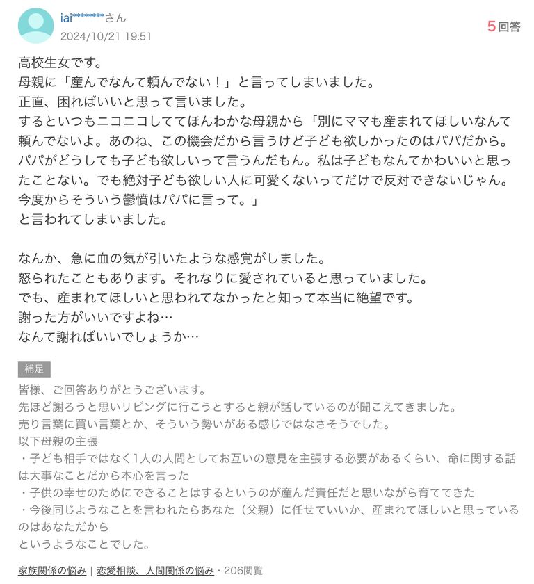 母親に「産んでなんて頼んでない!」と言ってしまいました。