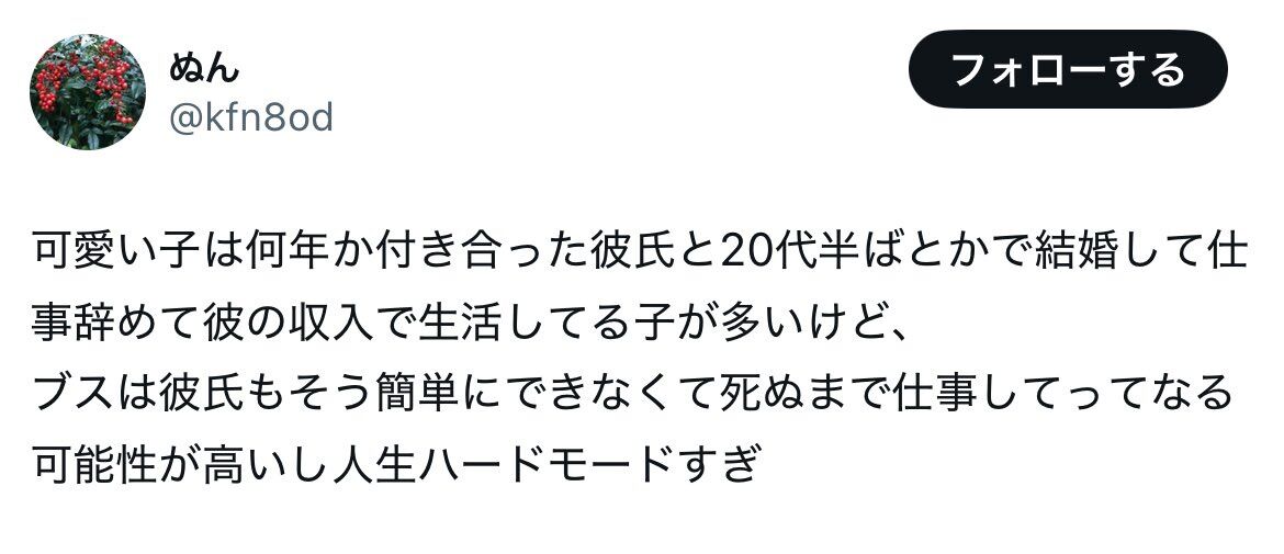 ん?男はブスだろうがイケメンだろうが働かなきゃいけないけど?